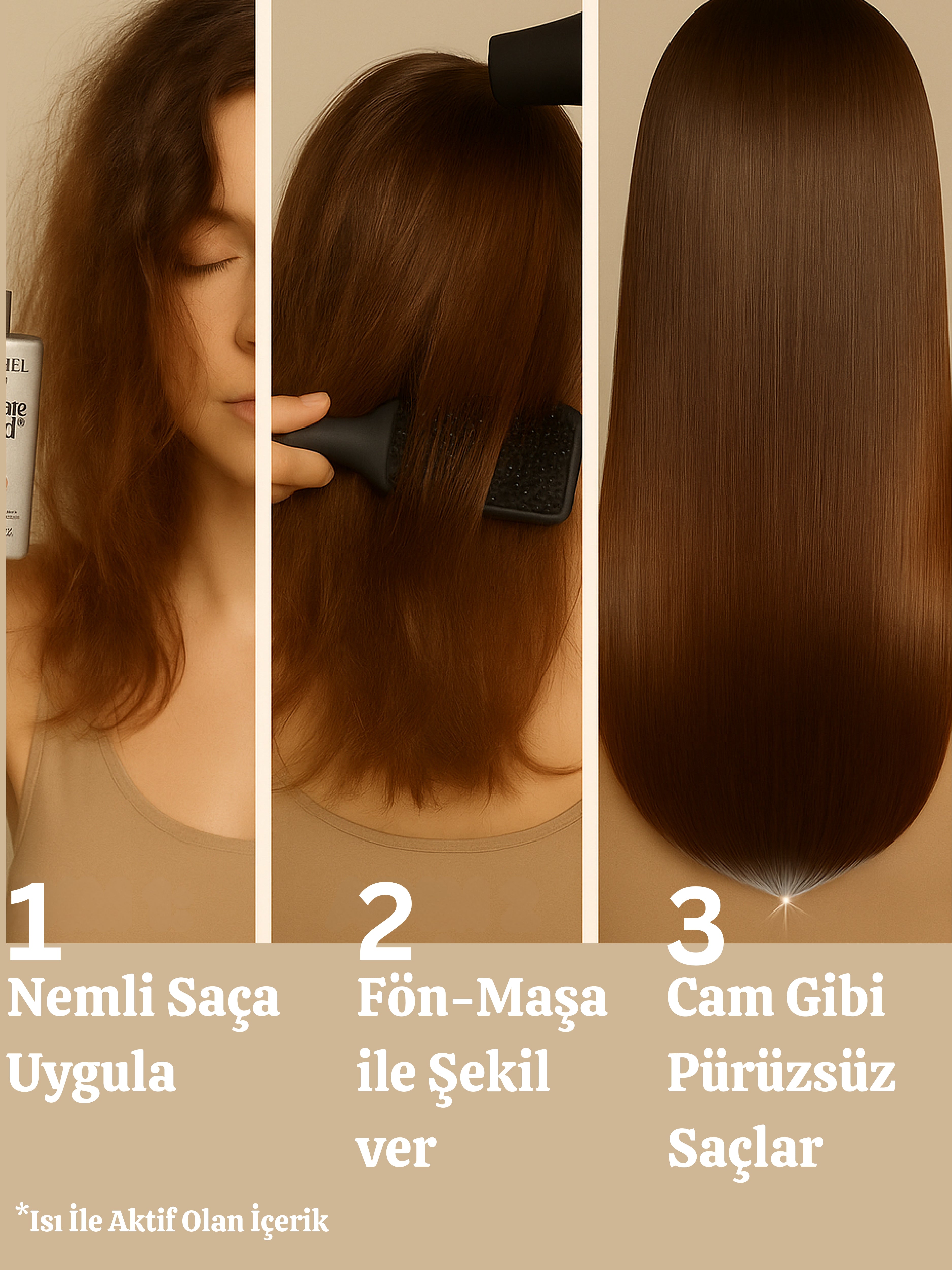 Fön veya düzleştirici ısısıyla aktive olur; saç telini kaplayan moleküler film oluşturur.